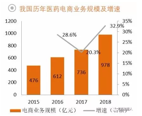 根据米内网数据,2018年我国公立医院、基层医疗机构、零售药店三大终端的药品销售额为17131亿元,同比增长6.3%。而与之相比,我国的医药电商业务规模仅978亿元,在整个药品销售额的渠道盘子里占比微乎其微,但是是不可忽视的“后来居上者”。