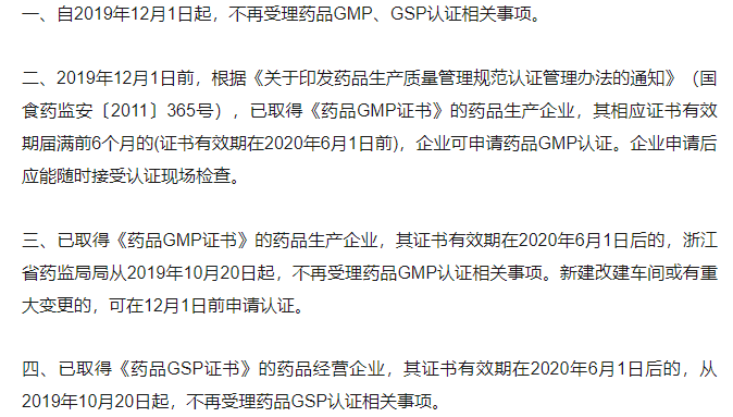 11月25日,广西自治区药监局发文,明确规定自2019年12月1日起,取消“药品生产质量管理规范(GMP)认证”和“药品经营质量管理规范(GSP)认证”行政许可事项,且不再受理相关申请。