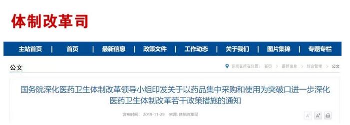 11月29日,国家卫健委体制改革司发布《国务院深化医药卫生体制改革领导小组印发关于以药品集中采购和使用为突破口进一步深化医药卫生体制改革若干政策措施的通知》(下称《通知》)。