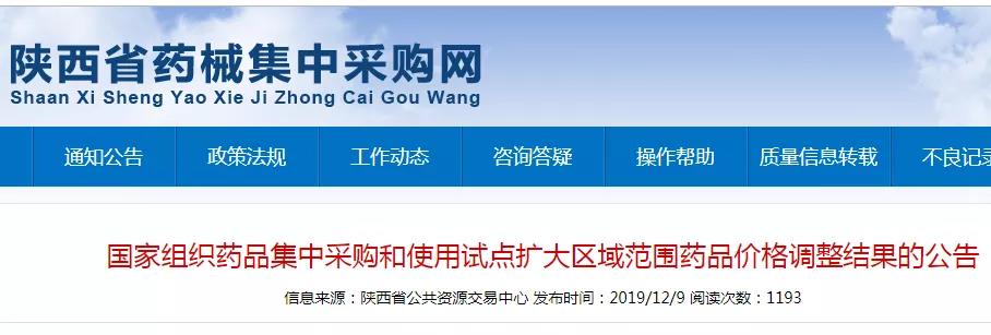 12月10日起,陕西省全省各级各类公立医疗机构、自愿参加试点扩围的驻陕军队医疗机构和医保定点社会办医疗机构(均不含试点城市西安市)须按新的挂网结果进行采购。