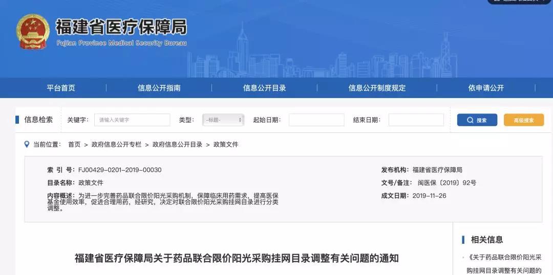 12月10日,福建省医疗保障局发布文件,对联合限价阳光采购挂网目录进行分类调整,在目录删减一项中,列入国家重点监控的品种予以删除——20个品种,基本告别福建市场。