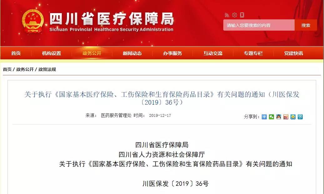 12月17日,四川医保局,四川人社厅发布通知,宣布2020年1月1起严格执行新版国家医保目录。各地不得自行制定目录或用变通的方法增加目录内药品,也不得自行调整目录内药品的限定支付范围。