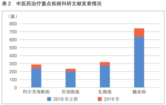 在疾病治疗相关研究方面,中医药治疗最热门领域包括阿尔茨海默病、肝细胞癌、乳腺癌和糖尿病等,其中有关中医药在糖尿病领域的科学文献,无论在历史储备和新增量中均处于绝对主导地位(表2)。数据显示,2019年,糖尿病领域新增中医药相关科研文献占比高达47.66%,其余三种疾病的科研文献新增数量占比不到20%。