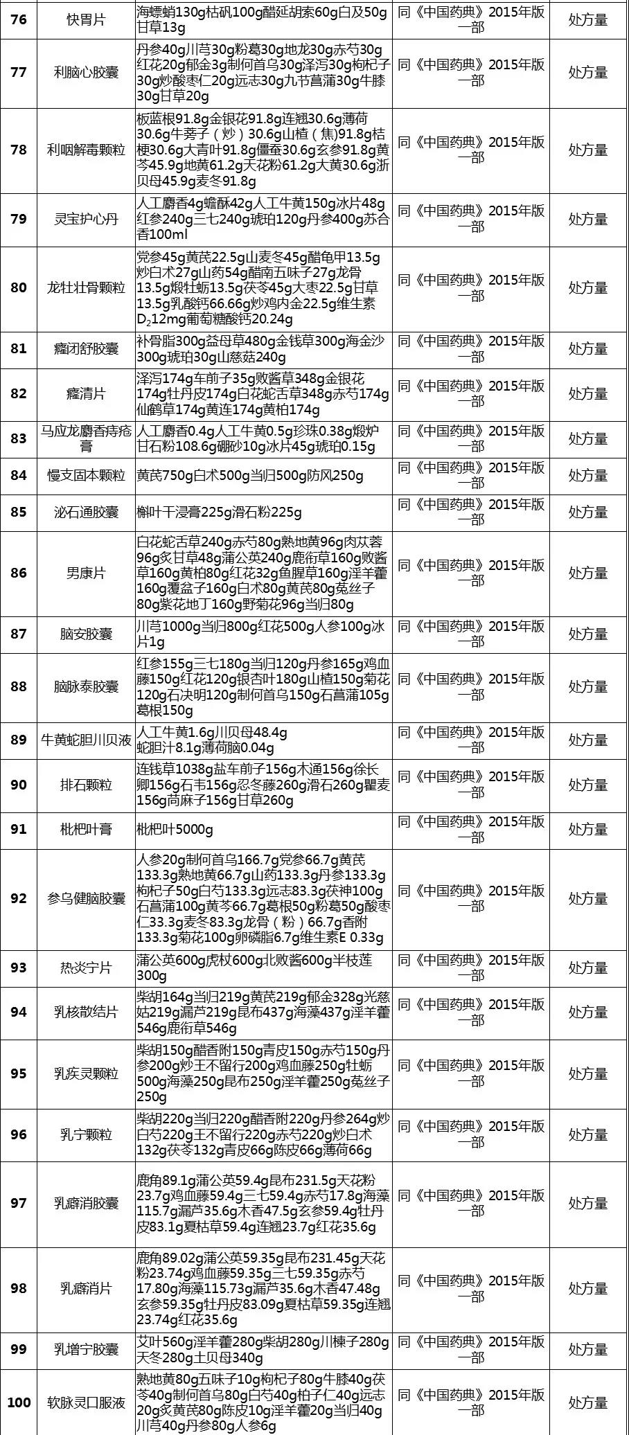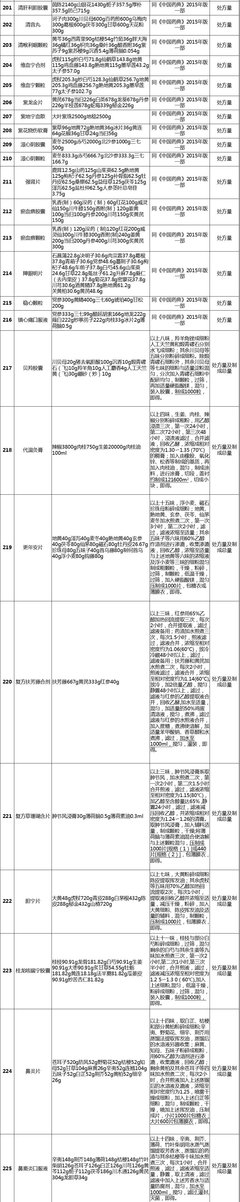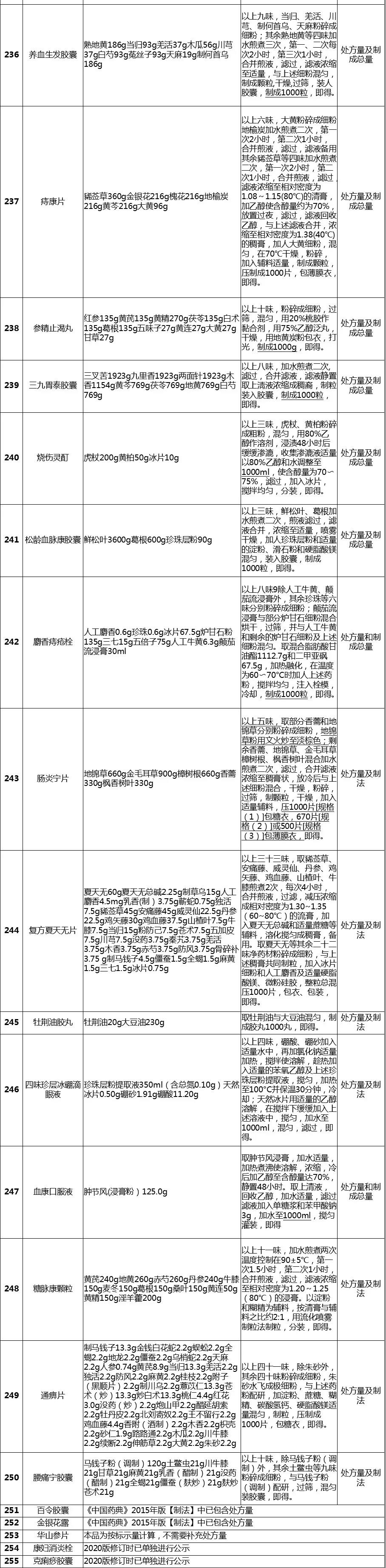 经梳理,该表共涉及255个中成药品种,除5个品种在2020版《中国药典》修订时已单独进行公示、2015年版《中国药典》【制法】中已包含处方量或不需要补充处方量外,其余250个品种均有新公开的处方量或制法的相关信息。