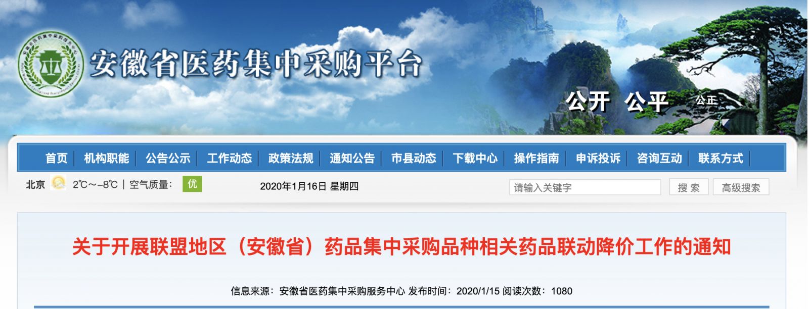 1月15日,安徽省发布文件《关于开展联盟地区(安徽省)药品集中采购品种相关药品联动降价工作的通知》,311个品种将自主申报降价,未按规定申报降价的,将被取消挂网资格。