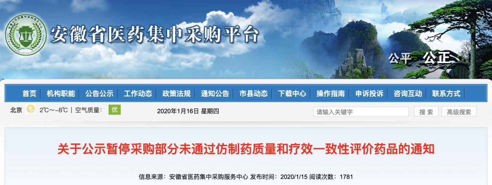 赛柏蓝了解到,根据《安徽省落实国家组织药品集中采购和使用试点扩围工作实施方案》等文件要求,与中选药品同品种药品通过一致性评价的生产企业达到3家以上的,在确保供应的情况下,药品集中采购中不再选用未通过一致性评价的品种,现对部分未通过仿制药质量和疗效一致性评价药品暂停挂网采购。