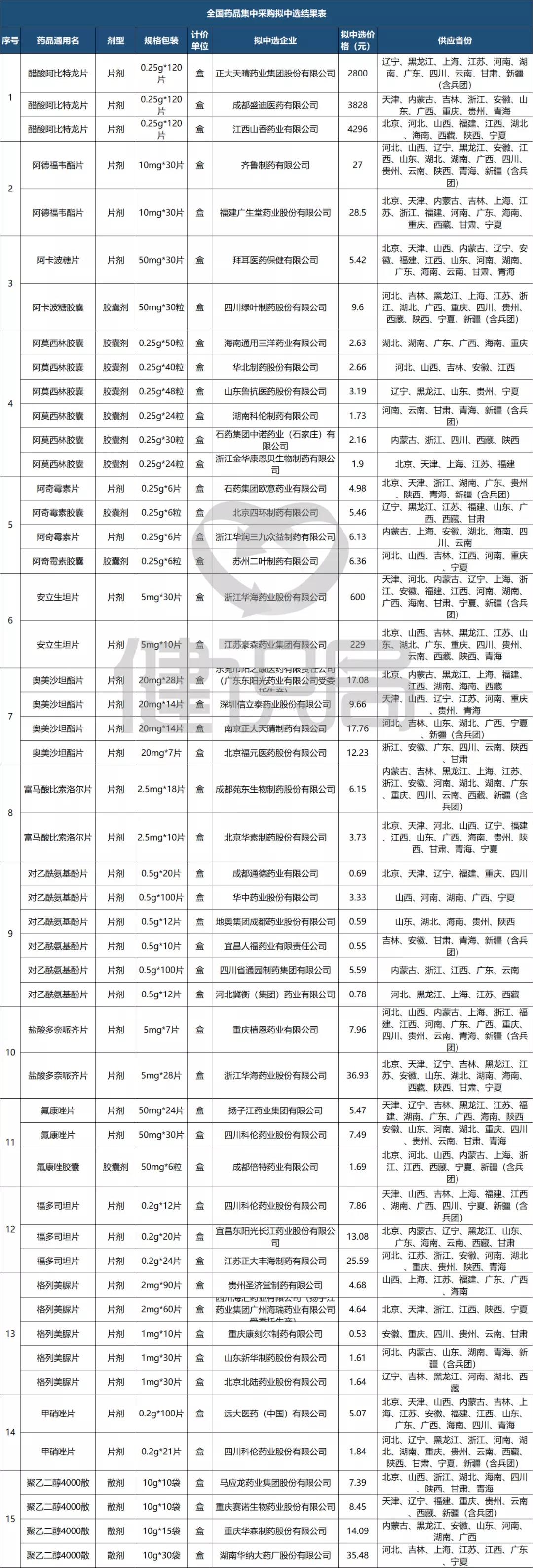 吲达帕胺片由烟台巨先药业有限公司、濮阳市汇源药业有限公司、重庆药友有限公司、国药集团工业有限公司、天津天士力(辽宁)制药有限责任公司5家企业中选,25mg*30片/盒的中标价分别是1.3元、1.93元、0.69元、1.39元、2.51元。
