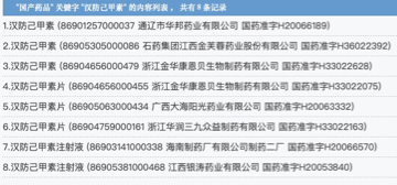 相较而言,汉防己甲素生产企业较多。从国家药监局官网查询到的数据显示,汉防己甲素涉及8个批文,分别为康恩贝生物制药2个、石药集团江西金芙蓉药业、通辽市华邦药业、广西大海阳光药业、浙江华润三九众益制药、海南制药、江西银涛药业各1个。