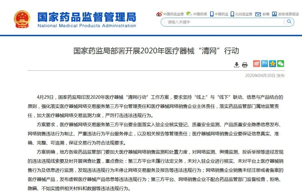医药网5月9日讯 日前,国家药品监督管理局印发2020年医疗器械“清网行动”工作方案,要求坚持“线上”与“线下”联动、信息与产品结合的原则,强化落实医疗器械网络交易服务第三方平台管理责任和医疗器械网络销售企业主体责任,落实药品监管部门属地监管责任,加大医疗器械网络交易监测力度,严厉打击违法违规行为。